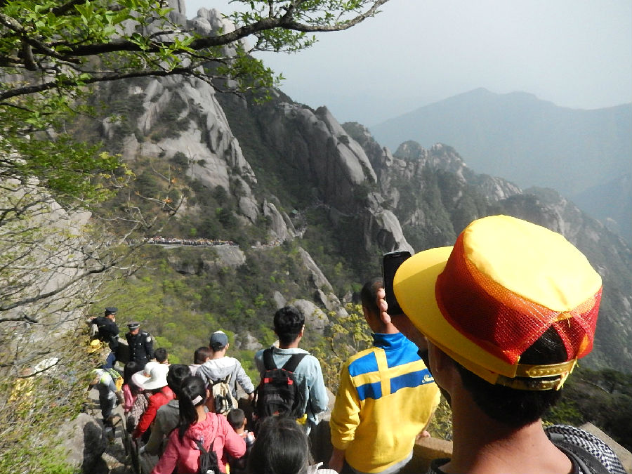 看過上圖,不知幾個人還能睡得好,雖然白天爬山太累??本人也本著之前去過一次黃山,認為黃山的風景還是很秀麗的,所以在今年5.1又帶家人去了一次,由于過節(jié)太擠了,索道太難等了,全家都是從云谷索道爬上去的,因為我去過一次,所以就由我?guī)ьI家人從以前走過的線路走的.本以為這次也帶家人看一看黃山在書中所寫的半山寺外抬頭見,展翅金雞叫道衢;登上龍蟠回首睹,扶肩五老上天都的風景,可惜月份去得太早了點,樹也才發(fā)芽,葉子都還沒有長出來,最難受的那就是人太多,一路是走走停停,不遠的路都要走比平時多幾倍的時間.